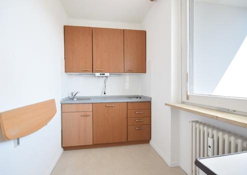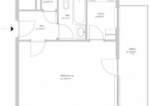 Der Eingangsbereich ist mit hellen Naturstein gestaltet und bietet Platz für eine Garderobe. Von hier aus erreicht man eine praktische Abstellkammer, das zeitlos modernisierte Badezimmer mit Badewanne sowie den Wohnbereich. Dieser ist mit neu verlegtem, hellem Eiche-Stäbchenparkett ausgestattet und profitiert von großen Fenstern, die viel Tageslicht hereinlassen. Der großzügige Ost-Balkon bietet einen angenehmen Blick ins Grüne und erweitert den Wohnraum ins Freie. Die Küche ist direkt an den Wohnbereich angeschlossen und ist mit einer praktischen Küchenzeile ausgestattet.