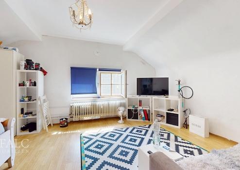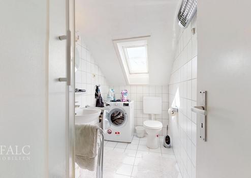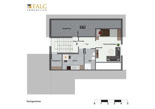 Das Dachgeschoss beherbergt eine weitere kleine Wohneinheit (Whg 4, 1-Zi. Whg mit Küche und Bad). Hier finden Sie ein großzügiges Wohn- und Schlafzimmer sowie ein zweckmäßiges Bad.