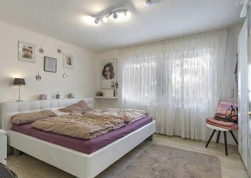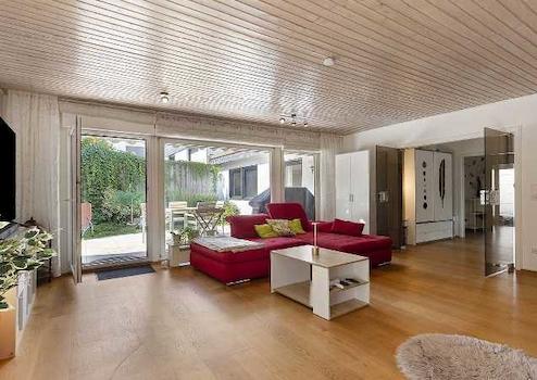 Im Erdgeschoss erwartet Sie eine Hauptwohnung mit vier Zimmern, bestehend aus einem großzügigen Wohnbereich, einer Küche, einem Schlafzimmer, zwei weiteren Zimmern, einem modernen Duschbad sowie einem separaten Gäste-WC. Die sonnige, großzügige Terrasse grenzt an den Wohnbereich und teilt sich über Eck in zwei aneinandergrenzende Flächen auf.