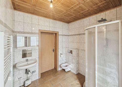 Über eine Treppe gelangen Sie in das Obergeschoss, wo sich zwei weitere Zimmer befinden. Diese Räume eignen sich hervorragend als Schlafzimmer für die ganze Familie. Jedes Zimmer ist hell und freundlich gestaltet, was eine angenehme Wohnatmosphäre schafft. Das Badezimmer auf dieser Etage ist mit einer Badewanne ausgestattet und bietet eine Oase zum Wohlfühlen.