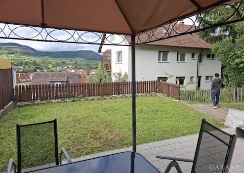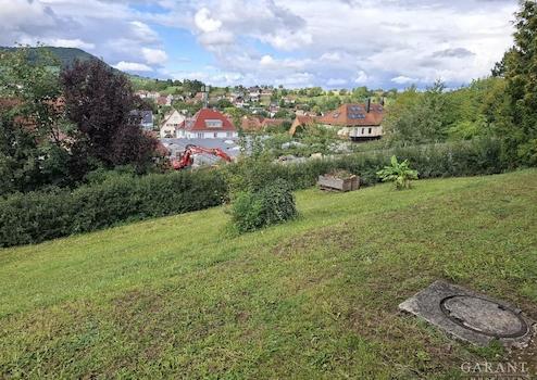 Das Hanggrundstück ist ca. 1.068 qm groß. Zur Straße hin stehen zwei Garagen.