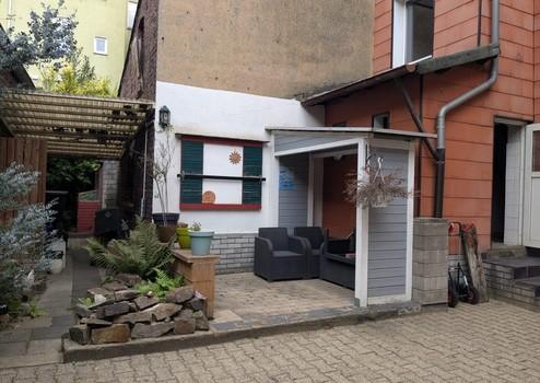 Zudem verfügt das Haus über einen Hinterhof mit Schuppen. Im Schuppen ist ein Schrank mit einer Spüle, sowie 2 Herdplatten verbaut. Platz für Kühlschränke ist ebenfalls vorhanden. Ideal für diverse Geburtstage und Feiern.
