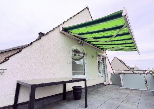 An die Küche schließt direkt eine ca. 17 m² große Dachterrasse an, die nicht nur bei Sonnenschein zum bei Frühstück an der frischen Luft einlädt. Eine Markise spendet dabei Schatten.