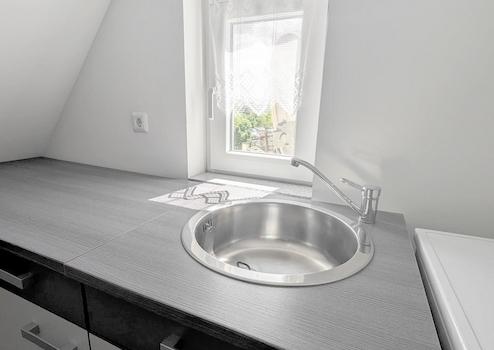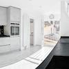 Die moderne Einbauküche (2019) bietet Granit-Arbeitsplatten, Siemens- und NEFF-Geräte, Induktionskochfeld, Backofen auf Sichthöhe, große Spülmaschine sowie praktische Details wie eine USB-Steckdose. Eine Abstellkammer mit Fenster ergänzt die Küche.