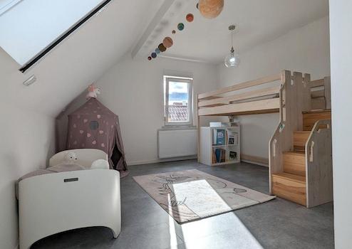 Das Herzstück bildet der ca. 40 m² große Wohn- und Essbereich mit Blick über die Weinberge. Die hochwertige Einbauküche (2019) verfügt über Granit-Arbeitsplatten, Geräte von Siemens und NEFF sowie eine angrenzende Abstellkammer. Vier Schlafzimmer, ein modernes Bad mit Regendusche, eine voll ausgebaute Waschküche sowie flexible Zusatzräume im Dachgeschoss eröffnen vielfältige Nutzungsmöglichkeiten.