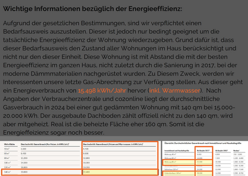 Aufgrund der gesetzlichen Bestimmungen, sind wir verpflichtet einen Bedarfsausweis auszustellen. Dieser ist jedoch nur bedingt geeignet um die tatsächliche Energieeffizienz der Wohnung wiederzugeben. Grund dafür ist, dass dieser Bedarfsausweis den Zustand aller Wohnungen im Haus berücksichtigt und nicht nur den dieser Einheit. Diese Wohnung ist mit Abstand die mit der besten Energieeffizienz im ganzen Haus, nicht zuletzt durch die Sanierung in 2017, bei der moderne Dämmmaterialien nachgerüstet wurden. Zu diesem Zweck, werden wir Interessenten unsere letzte Gas-Abrechnung zur Verfügung stellen. Aus dieser geht ein Energieverbrauch von 15.498 kWh im Jahr hervor. Nach Angaben der Verbraucherzentrale und co2online liegt der durchschnittliche Gasverbrauch in 2024 bei einer gut gedämmten Wohnung mit 140 qm bei 15.000-20.000 kWh. Der ausgebaute Dachboden zählt offiziell nicht zu den 140 qm, wird aber mitgeheizt. Real ist die beheizte Fläche eher 160 qm. Somit ist die Energieffeizienz sogar noch besser.