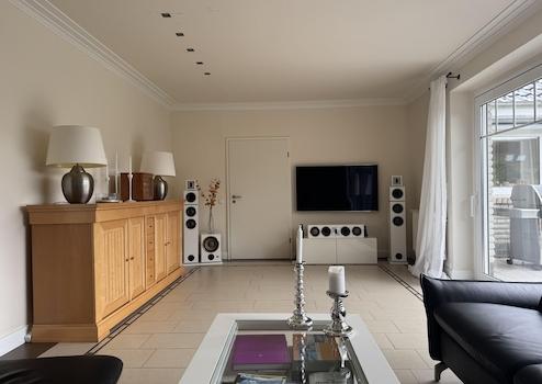 Wohnbereich öffnet sich über große Fenster zum Garten und auf die Terrasse – ideal für lange