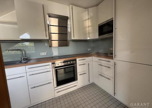 Die angrenzende, hell gehaltene Küche ist mit einer modernen, geschmackvollen Einbauküche ausgestattet - hochwertig in der Ausführung und durchdacht in der Gestaltung. Kochen, Genießen und Wohnen gehen hier nahtlos ineinander über.