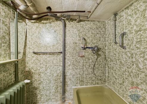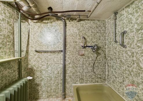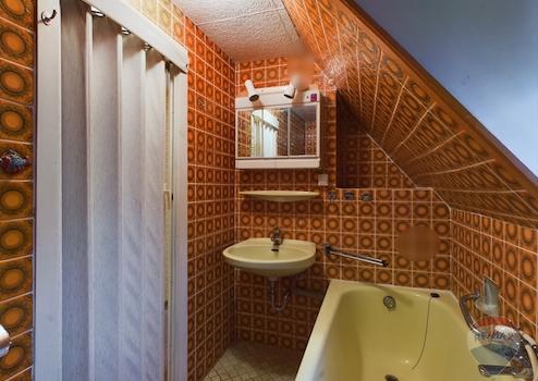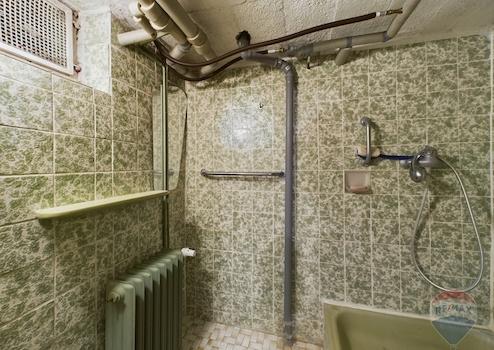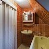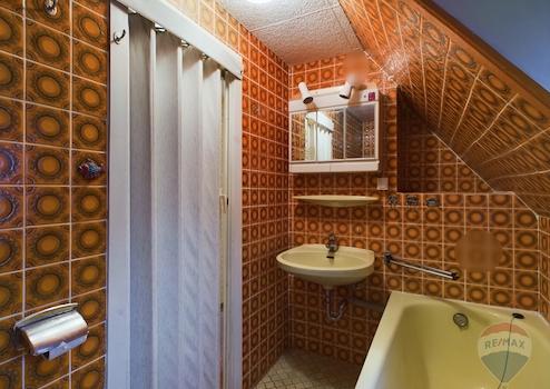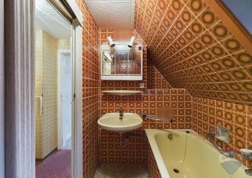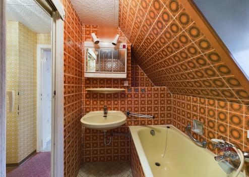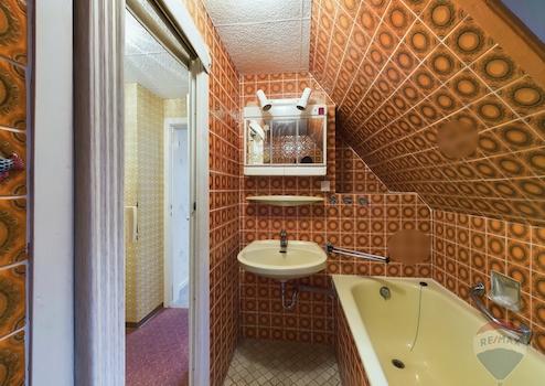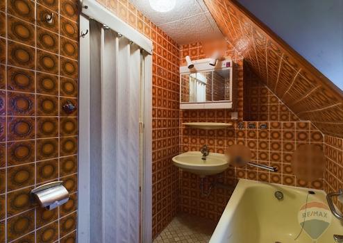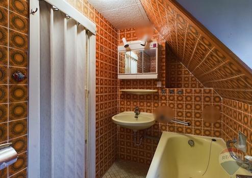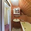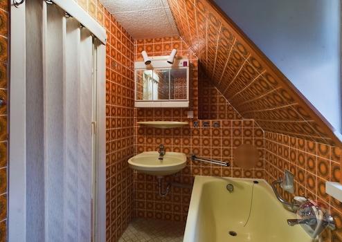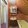 Im Obergeschoss befindet sich zur rechten ein individuelles Vollbad mit jeder Menge Charme der 50er Jahre.