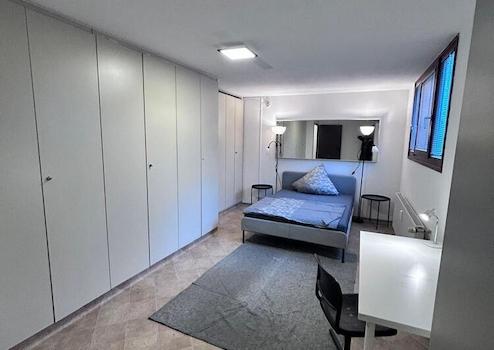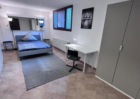 Modern möbliertes Apartment mit grozügigem Wohn/Schlafbereich, möbliert mit Doppelbett, Kleiderschrank und Essbereich. Bad mit Fenster und Badewanne. Separate, voll ausgestatte Küche.