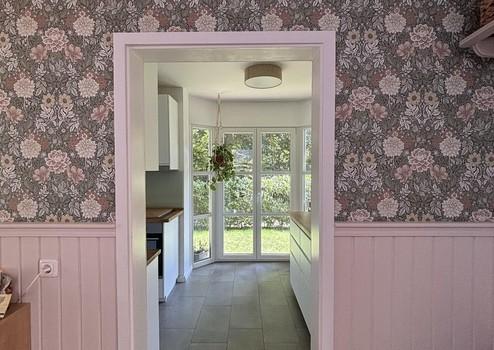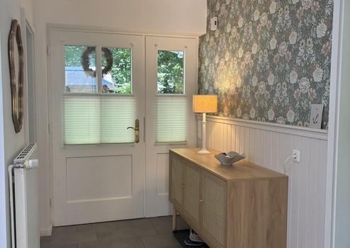 Erdgeschoss: Flur, Gäste-WC, Küche mit Zugang zum Garten, offener Wohn- und Essbereich mit Zugang zur Terrasse.