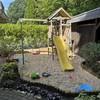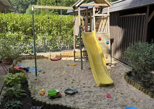 * Kindgerechte Ausstattung mit Sandkasten und Klettergerüst
