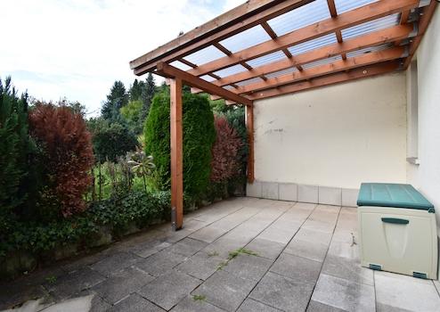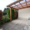 überdachte Terrasse, Konstruktion = Holz, Dach = PVC (2015), Fußboden = Steinplatten