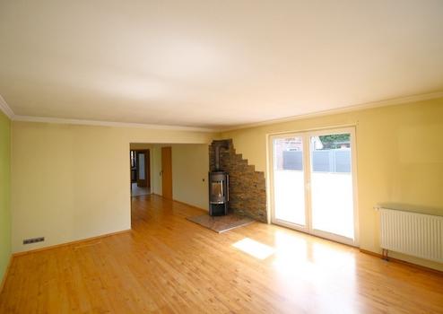 Großzügiges Wohn-/Esszimmer mit 2 Ausgängen zur umlaufenden, teilweise überdachten Terrasse, ein weiteres Zimmer, Küche mit Einbauküche, Flur mit Garderobe, Hauswirtschaftsraum, Gäste-WC, Abstellraum unter der Treppe