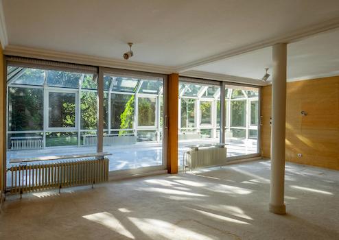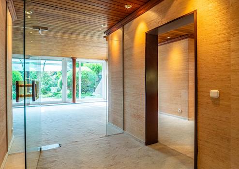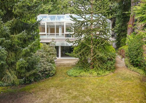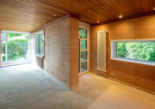 Das massive Wohnhaus wurde Anfang der siebziger Jahre in Split-Level-Bauweise errichtet. Der Grundriss gestaltet sich mit großzügigen Räumen auf vier versetzten Ebenen. Raumbreite Fensterfronten öffnen sich zum Garten und der Wintergarten im Obergeschoss ermöglicht einen Rundblick über das idyllische Grundstück.