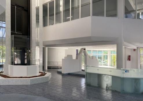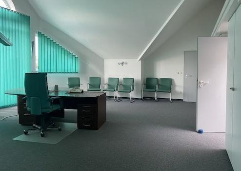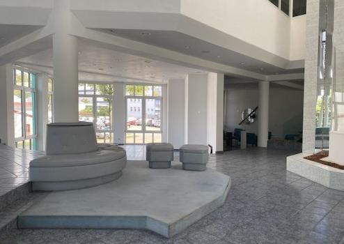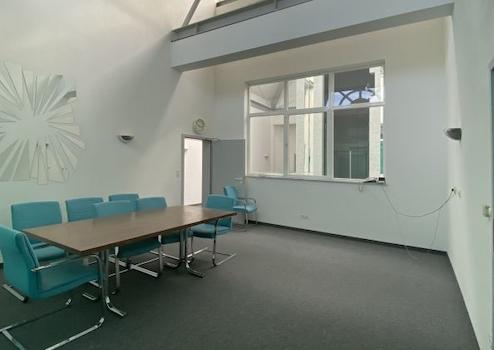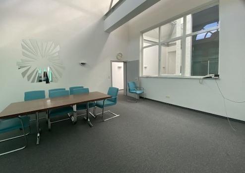 Die modernen großen Ausstellungsflächen im Erdgeschoss sind über eine große Schleuse mit elektrischen Glasschiebetüren begehbar und aufgrund der vielen Fenster und Lichteinstrahlung vom Lichthof optimal mit Tageslicht versorgt. Sie ist bis auf das Büro- und Besprechungszimmer, welche mit Teppichböden ausgelegt sind, gefliest. Die Teeküche mit Einbauküche und WCs sind gefliest.