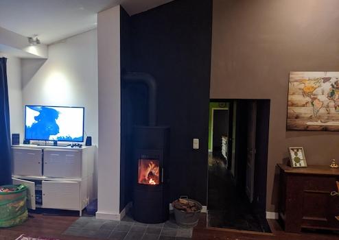 Für zusätzliche Behaglichkeit sorgt ein hochwertiger Kaminofen (2016) im offenen Wohnbereich, der an kalten Tagen eine gemütliche Atmosphäre schafft und Heizkosten senkt.