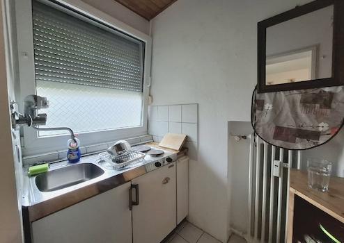 Kleine Küche mit Fenster und Türe zum Wohnbereich