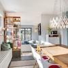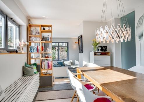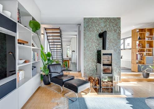 Die außergewöhnliche Formensprache setzt sich im Innenbereich fort. Den zentralen Mittelpunkt des erstklassig geschnittenen Hauses bietet sicherlich die offen gestaltete Küche sowie der angrenzende, großzügige Wohn- und Essbereich mit Zugang zum gestalteten Garten in sonniger Süd-/West-Ausrichtung. An kühlen Tagen vor dem Kamin, in den Sommermonaten auf den nach Süden und Westen ausgerichteten Terrassen. Zahlreiche Fenster, Raumteiler aus Glas und eine faltbare Wand lassen auf dieser Ebene wunderschöne Sichtachsen entstehen. Je nach Bedarf lassen sich so ruhige und geschützte als auch offene Bereiche schaffen. Ein Gäste-WC und eine Vorratskammer ergänzen das Erdgeschoss.