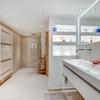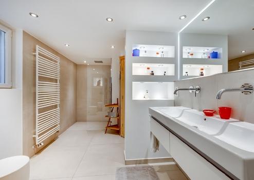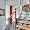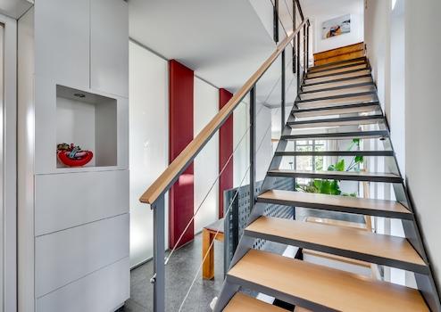 Eine formschöne Stahltreppe führt Sie ins Obergeschoss. Neben zwei Schlafzimmern und einem Masterbad mit Badewanne und Dusche unterstreicht der an drei Seiten umlaufende Austritt mit Reling die Architektursprache.