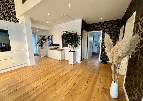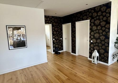 Die großzügige Wohnfläche von etwa 295 m² erstreckt sich über zwei Etagen und bietet ein luxuriöses Ambiente in jeder Hinsicht. Der offene Wohnbereich mit bodentiefen Fenstern schafft eine helle, einladende Atmosphäre und ermöglicht einen malerischen Blick auf den gepflegten Garten. Natürlich darf die Fußbodenheizung nicht fehlen.