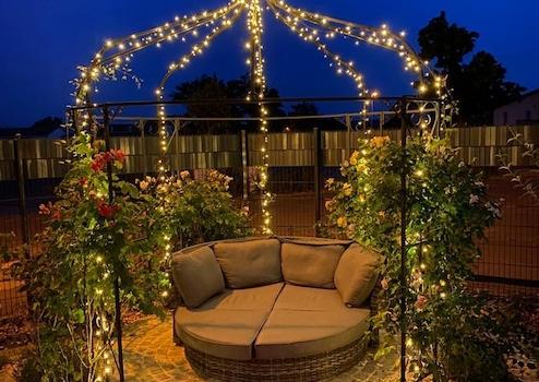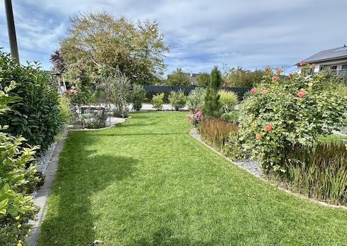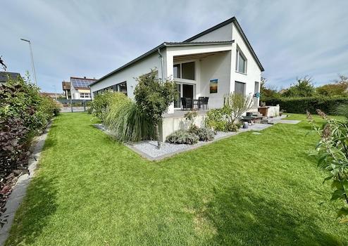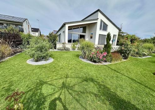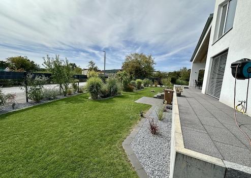 Das Grundstück selbst präsentiert sich als liebevoll gestaltete grüne Oase, die Ruhe und Privatsphäre bietet. Der Garten benötigt nicht viel Aufmerksamkeit, da dieser über eine automatische Bewässerung und Mähroboter verfügt.
