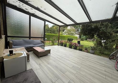 Das Wohnzimmer besticht durch seine großzügige Fensterfront, die viel Tageslicht hereinlässt und eine angenehme Atmosphäre schafft. Das Schlafzimmer bietet direkten Zugang zur überdachten Terrasse, die ideal für entspannte Stunden im Freien ist. Ein weiteres Zimmer kann flexibel als Büro oder Gästezimmer genutzt werden.