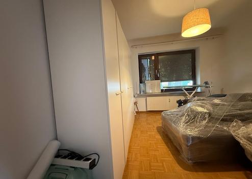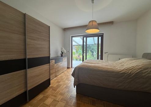 - Schlafzimmer mit Zugang zur Terrasse, Parkettboden