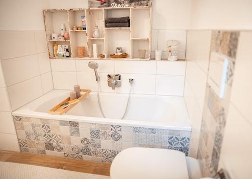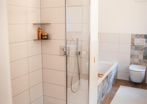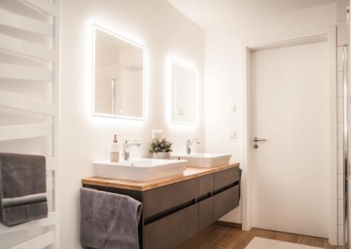 - Badezimmer mit Badewanne, großer Dusche, Doppelwaschbecken &