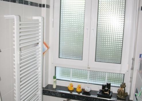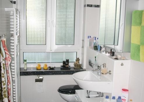 Bad neu gefließt (Fußboden Naturstein (Blue -Pearl - Granit), Badheizkörper, Alu-Spiegelschrank), Porzellan mit Keratectbeschichtung (schmutzabweisend).