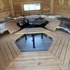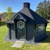 Im Vorgarten steht auf fester Betonplatte eine finnische Grill-Kota für eine gemütliche Zeit mit bis zu 14 Freunden. Wenn man jedoch das Dach öffnet, um den vorhandenen Holzkohlegrill anzuzünden, sollte man sich besser auf nur 6 Personen begrenzen.