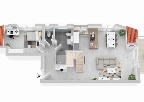 Das Herzstück der Wohnung ist der offene Wohn-, Ess- und Kochbereich im unteren Geschoss. Große Fensterflächen lassen viel Tageslicht herein und schaffen eine freundliche, einladende Atmosphäre. Von hier aus betreten Sie auch den Balkon, der zusätzlichen Wohnraum im Freien bietet. Auf dieser Ebene befinden sich außerdem ein Schlafzimmer, ein modernes Bad und ein Gäste-WC, sodass ein komfortabler Alltag gewährleistet ist.