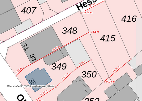 Das der Oberstraße zugewandte Flurstück 349 (423 qm) ist bebaut mit einem interessanten Einfamilienhaus (Bj 1936) mit insg. 102 qm Wohnfläche. Das zweite Flurstück (295 qm) angrenzend am Hessenweg wird derzeit als Garten genutzt, ist aber als baureifes Land ausgewiesen.