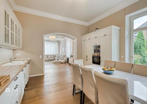In den oberen Geschossen finden Sie mehrere Schlafzimmers sowie weitere herrschaftliche Wohnbereiche die alle geräumig und hell sind. Eine zweite Küche bietet zudem Zugang zu einer weiteren Terrasse. Die Badezimmer sind modern ausgestattet und bieten sowohl Badewanne als auch Dusche.