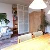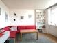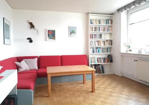 Rechts gegenüber des Vorraums befindet sich der optimal geschnittene 20 qm große Wohnbereich. Die großen Fenster in Westausrichtung fangen das wunderbar warme Abendlicht ein. Ein maßgenau vom Schreiner gefertigter Einbauschrank kann auf Wunsch übernommen werden.