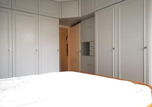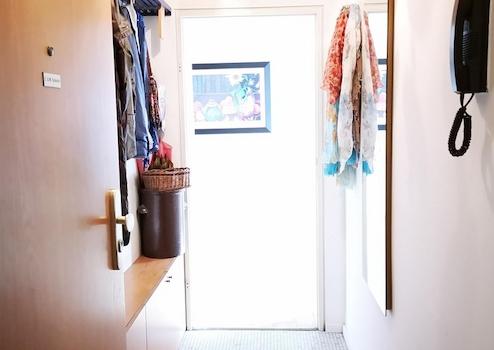 Ein Flur auf der linken Seite des Esszimmers führt zum Duschbad, dem separaten WC, dem Schlafzimmer und einer sehr praktischen Abstellkammer. Im Schlafzimmer bieten die ebenfalls vom Schreiner auf Maß angefertigten Einbauschränke viel Stauraum. Im Duschbad gibt es einen Waschmaschinenanschluß.