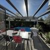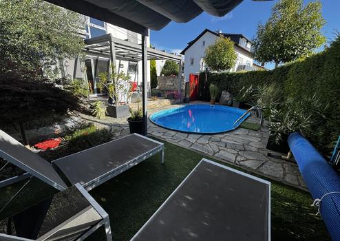 Im Erdgeschoss befindet sich die erste Wohneinheit mit hellem Wohn- und Essbereich, angrenzender Küche samt Vorratsraum, einem Schlafzimmer, Ankleideraum, Badezimmer, Gäste-WC und einem Technikraum, der aktuell als Büro genutzt wird. Vom Wohn- und Essbereich gelangen Sie direkt auf die Terrasse. Durch das Glasdach sowie absenkbare Jalousien können Sie diese das gesamte Jahr über nutzen. Das Highlight bildet der Garten mit Pool - hier lässt es sich leben.