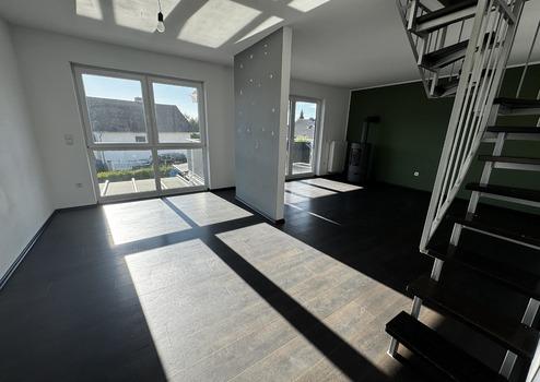 Die zweite Wohneinheit erstreckt sich als Maisonette über das Ober- und Dachgeschoss. Im Obergeschoss befinden sich ein großzügiger Wohn- und Essbereich mit Küche und Vorratsraum, zwei Schlafzimmer, ein Badezimmer, Gäste-WC und ein Balkon. Über die moderne Treppe erreichen Sie das Dachgeschoss mit einem weiteren Schlafzimmer oder Rückzugsort.