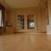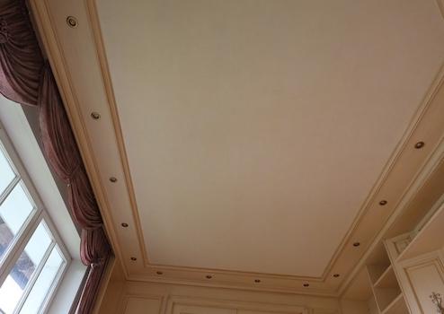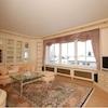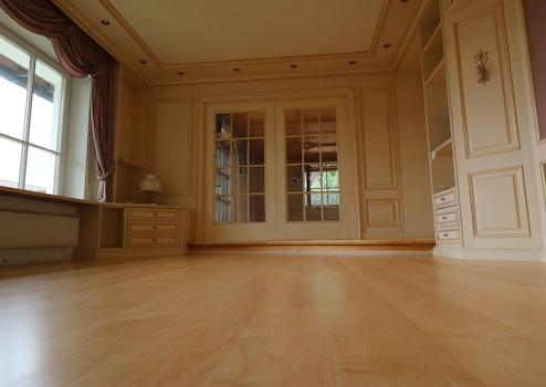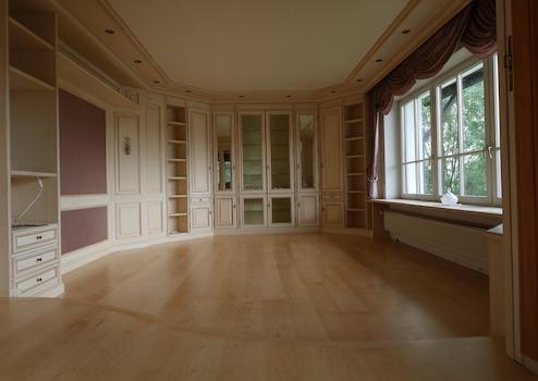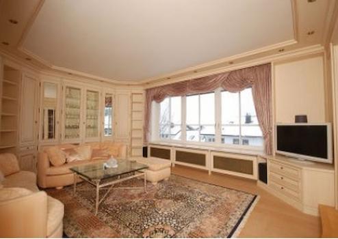 Das Wohnzimmer ist komplett im sogenannten klssischen Stil eingebaut mit Möbeln, die speziell für diesen Raum hergestellt wurden. Die Fronten sind in Rahmen-Füllung mit einer Strichlack Oberfläche und mit feinen mit Blattgold belegten Stäbchen ausgeführt. Die handgespachtelte Decke ist ringsum umrandet mit einem mehrfach profilierten Deckenanschlussprofil mit eingebauten Deckenstrahlern. Der Boden des Wohnzimmers ist mit Ahorn Parkett ausgestattet.
