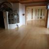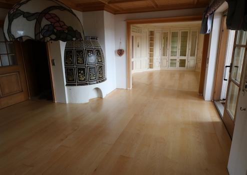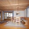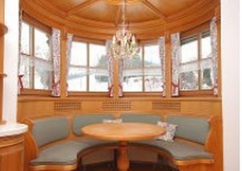 Die Möblierung im Esszimmer besteht aus einer von einem Schreiner eingebauten Eckbank aus massiver Fichte mit Tisch und 4 Stühlen, einer Eckvitrine und einer Ofenbank. Die Oberflächen sind aus natürlicher Fichte gebeizt und matt lackiert. Ein schöner Kachelofen auf der gegenüberliegenden Seite mit handgemalten Verzierungen sorgt für gemütliche Wärme. Der Kachelofen wird vom Keller aus beheizt. Ergänzt wird die Stube durch eine aufwändig gearbeitete Kassettendecke ebenfalls als Schreinerausführung in Fichte.