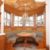 Die Einbauküche mit Essplatz im Runderker ist nach Maß von einem Schreiner hergestellt und eingebaut. Die Holzart ist Weymouthskiefer natur lackiert. Die Fronten sind in Rahmen-Füllung und eigens ausgesuchtem Holzbild hergestellt. Die Arbeitsplatte besteht aus Marmor Naturstein. Der Esserker mit Rundbank und rundem Tisch ist ebenfalls aus Weymuthskiefer hergestellt. Zusammen mit der Holzdecke, den mit Kannelüren versehenen Stollen mit geschnitzten Aufsätzen, der geschnitzten Rosette ist der Esserker ein einzigartiges Ensemble.
