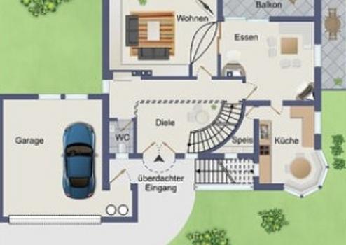 Links neben dem Haus befindet sich eine Doppelgarage mit davorliegenden Stellplätzen. Die Garage hat ein elektrisches Schwingtor mit Fernbedienung und ist durch eine Seitentür vor dem Hauseingang mit Überdachung begehbar.