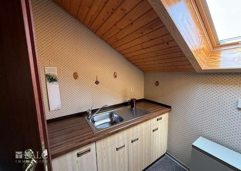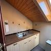 Angrenzend an das Wohnzimmer befindet sich im Süd Ostflügel des Hauses das Esszimmer. Direkt daneben im Nordosten ist die Küche. Diese Einbauküche stammt vom Mieter und ist 30 Jahre alt, ist unverändert funktional gestaltet. Die Küche bietet auf jeden Fall genügend Platz für eigene Gestaltungswünsche.