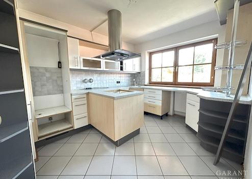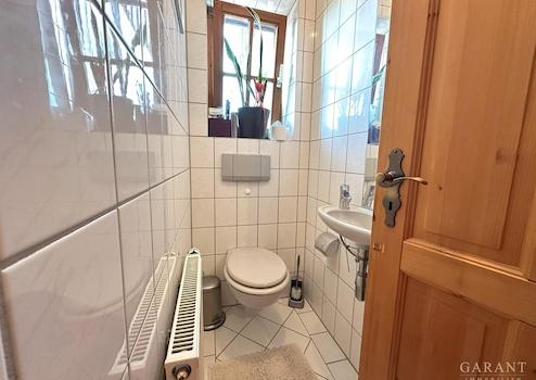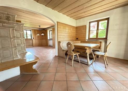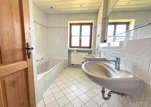 Großes offenes Wohn- und Esszimmer mit Kachelofen , Schlafzimmer, Küche, Hauswirtschaftsraum, Speise-/Abstellkammer, Gäste-WC, Tageslichtbad mit Badewanne, Dusche, WC und zwei Waschbecken, Terrasse