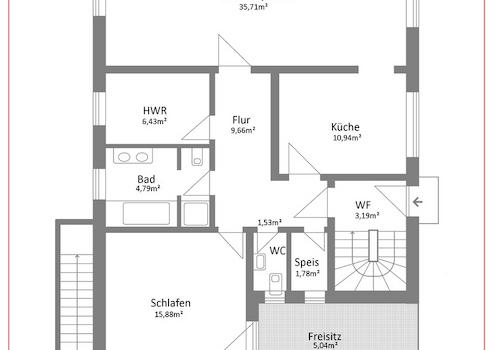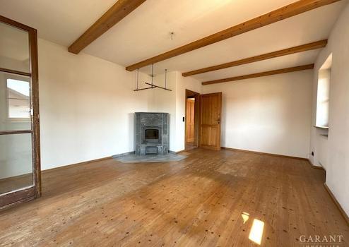 Wohnzimmer mit Specksteinofen, Schlafzimmer, Kinder-/Arbeitszimmer, Küche mit Einbauküche ohne Geräte, Hauswirtschaftsraum, Speise-/Abstellkammer, Gäste-WC, Tageslichtbad mit Badewanne, Dusche, WC und zwei Waschbecken, großer Balkon
