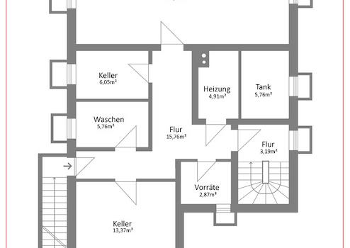 drei Kellerräume, Waschküche mit Anschlüssen für drei Waschmaschinen, Heizungsraum, Raum mit Öltank, Vorratsraum