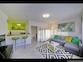 Der Küchenbereich beinhaltet ein Induktionskochfeld, Microwelle und Waschmaschine mit integriertem Wäschetrockner und allen Küchenutensilien für den täglichen Bedarf.