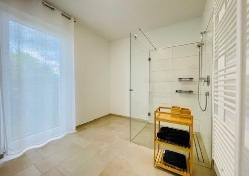 schöner Dielenbereich, ein großes und geschmackvoll ausgestattetes Tageslichtbad mit sandfarbenem, großflächigem Fliesenbelag, Glasdusche, Handtuchwärmer, Waschtisch und WC, ein schönes Schlafzimmer, ein Abstellraum mit Waschmaschinenanschluss und ein großzügiger, lichtdurchfluteter Wohn- Essbereich mit offener Küche. Bodentiefe Fensterflächen ermöglichen den Zugang auf die sonnige und teilweise überdachte Terrasse mit Südausrichtung.