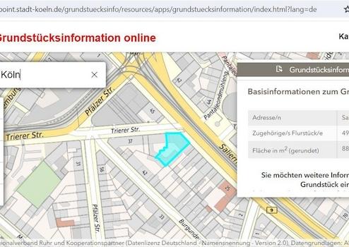 Gemarkung Köln, Flur 34, Flurstück 274 (4958-34-274). Eckgrundstück mit Blockrandbebauung, auf der Nordostseite an den Salierring und auf der Nordseite an die Trierer Str. grenzend.