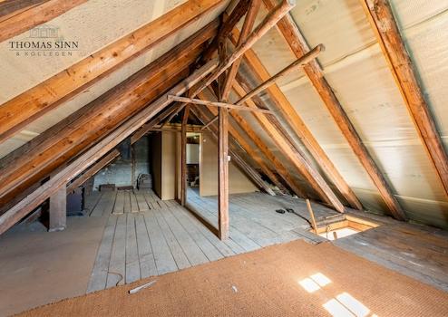 Über die Dachboden-Einschubtreppe gelangt man in den geräumigen Spitzboden mit Aufstellort der Gas-Brennwerttherme und großem Potenzial für weiteren Wohnraum. Im Zuge einer Dachsanierung ließe sich hier mittels Dachgaupen und Dachfenstern, sowie einer Erweiterung des Treppenhaueses, ein helles Studiozimmer realisieren.